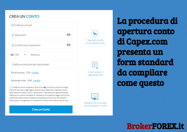 Per aprire un account con CAPEX, l’utente deve semplicemente accedere al sito di Capex (qui la pagina d’apertura conto) e seguire la procedura di registrazione. Sarà necessario fornire un indirizzo email valido, una password e il proprio numero di telefono, selezionare la valuta preferita (EUR è impostata di default). A quel punto, bisognerà spuntare la casella dove si conferma di aver superato i 18 anni e di accettare la normativa sulla privacy e il gioco è fatto.